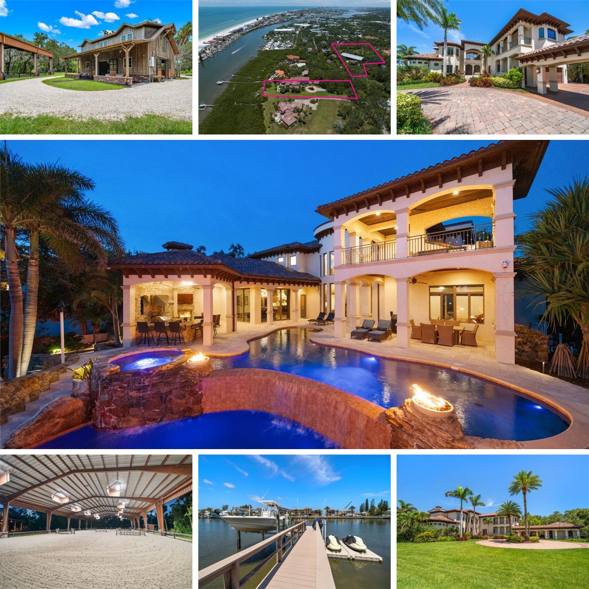 An estate where two elite worlds collide- WATERFRONT luxury & EQUESTRIAN prestige. Tucked away behind a canopy of majestic oaks, a winding Tennessee fieldstone driveway leads you to a Mediterranean-inspired masterpiece that redefines elegance and luxury. Crafted by renowned Brandon Construction, this private estate is a true tropical paradise, created for those with the most discerning taste. Custom double entry doors open to an awe-inspiring interior—where sophistication and thoughtful design meet. The private office offers quiet productivity, while the breathtaking living and dining room commands attention with soaring floor-to-ceiling windows that perfectly frame the resort-style pool and lush outdoor living areas. The chef’s kitchen is the heart of the home, featuring granite countertops, a center island with prep sink, breakfast bar, pot filler, custom built-in Miele fridge & freezer, gas cooktop, and a walk-in pantry—all open to a warm and spacious family room with beamed coffered ceilings, a cozy fireplace, and sliders to the outdoor oasis. Every detail has been considered, from the pool bath, mudroom, and laundry room to the theater room with stage and stadium seating—ideal for movie nights or performances. The primary suite is a serene retreat, flooded with natural light and accented by rich wood beams, a jaw-dropping custom walk-in closet with center island, and a spa-like bath with jetted tub, double walk-in shower with triple heads, dual vanities, a dressing table, and a hidden passage to the home office. Additional bedrooms and bathrooms are designed to pamper family and guests alike. Step outside and you’re transported to your own luxury resort—complete with a two-level heated pool and spa, outdoor kitchen, fireplace, and multiple entertaining areas. For boating enthusiasts, a TREX dock with a 10,000 lb lift offers direct access to the Intracoastal, while west-facing views provide spectacular sunsets that melt into the Gulf. But the crown jewel of this estate may be its custom-built barn—featuring rubber paver flooring, stalls with custom cushion mats, a tack room with custom saddle racks, feed room, covered and lit riding arena for nighttime rides, and a loft with full kitchen and bath, perfect for an on-site trainer or in-law suite. Spring-fed streams weave through the grounds, adding a touch of magic to this must-see property. Overlooking the Narrows and nestled in nature yet minutes from shopping, dining, and the beach—this is more than a home; it’s a once-in-a-lifetime opportunity to live your dream.